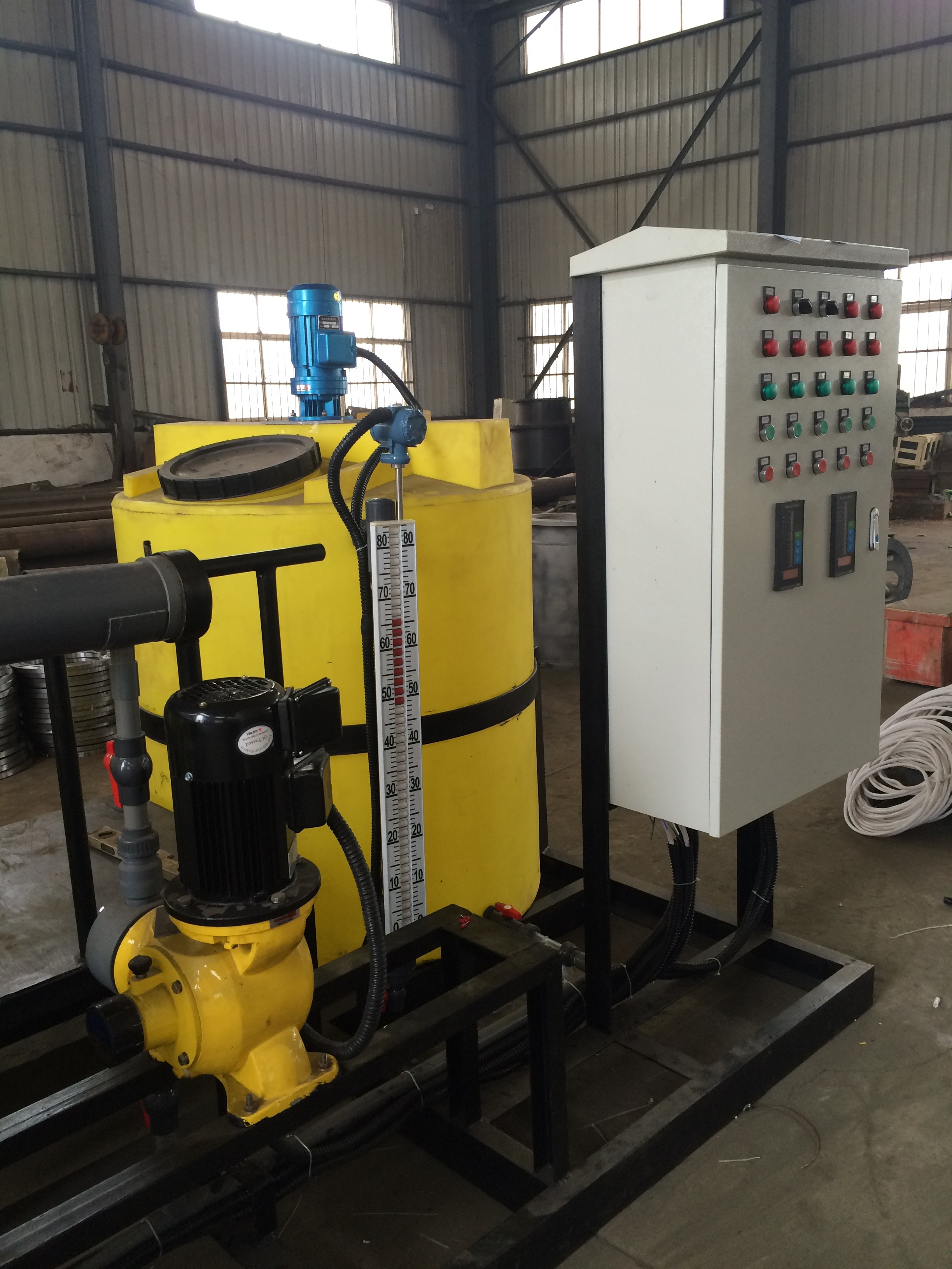 全自動(dòng)一體化加藥裝置以計(jì)量泵為主要投加設(shè)備、將溶藥箱、攪拌器、液位計(jì)、安全閥、止回閥、壓力表、過濾器、緩沖器、管路、閥門、底座、扶梯、自動(dòng)監(jiān)視系統(tǒng)、電力控制系統(tǒng)等按工藝流程需要組裝在一個(gè)公共平臺(tái)上,形成一個(gè)組合式單元。配有攪拌系統(tǒng)、加藥系統(tǒng)和自動(dòng)控制系統(tǒng),幾個(gè)固定式可組合成一個(gè)整體。